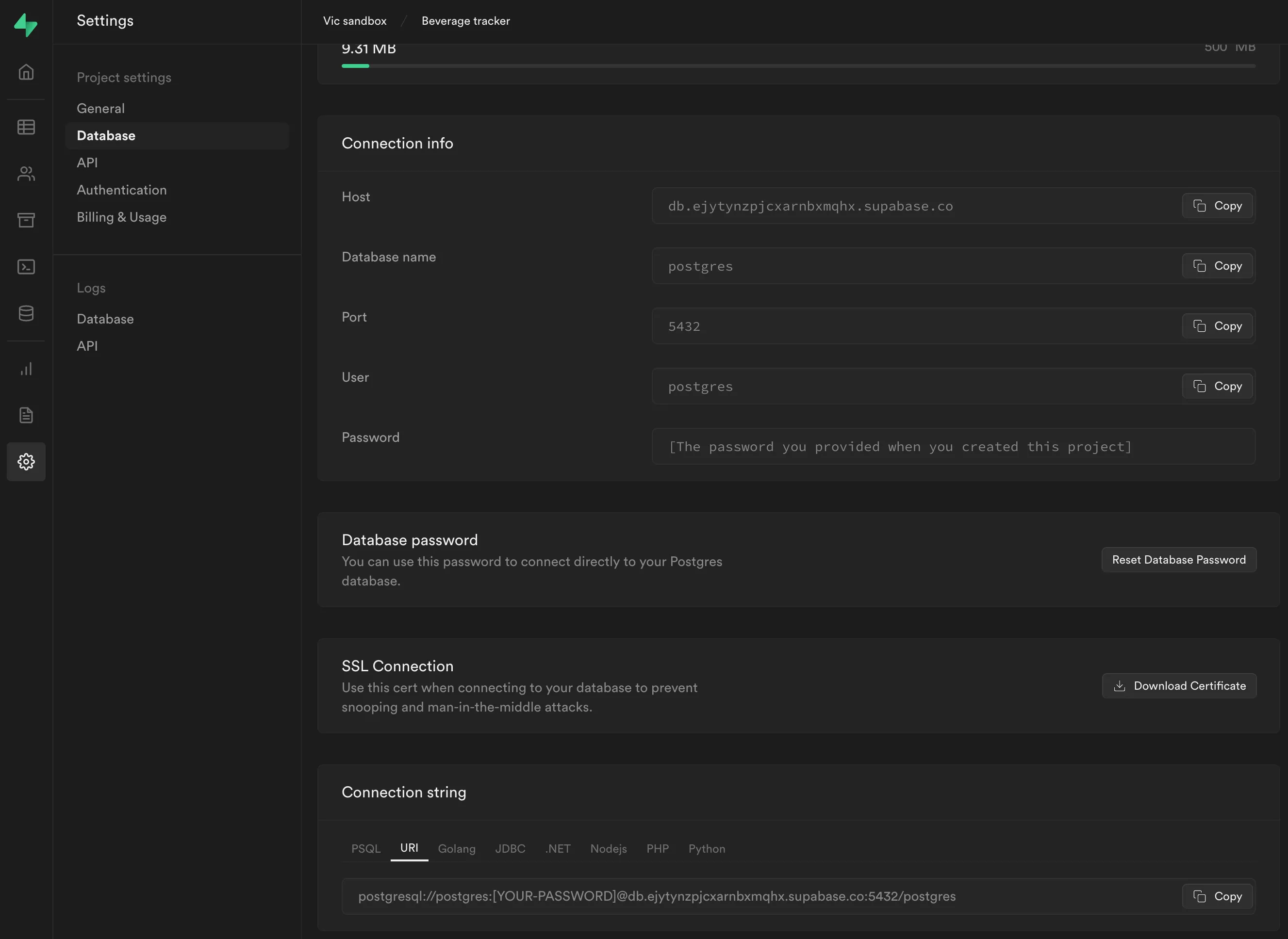 After your database has been created, go to Settings > Database, scroll down to the bottom, and copy the connection string URI.